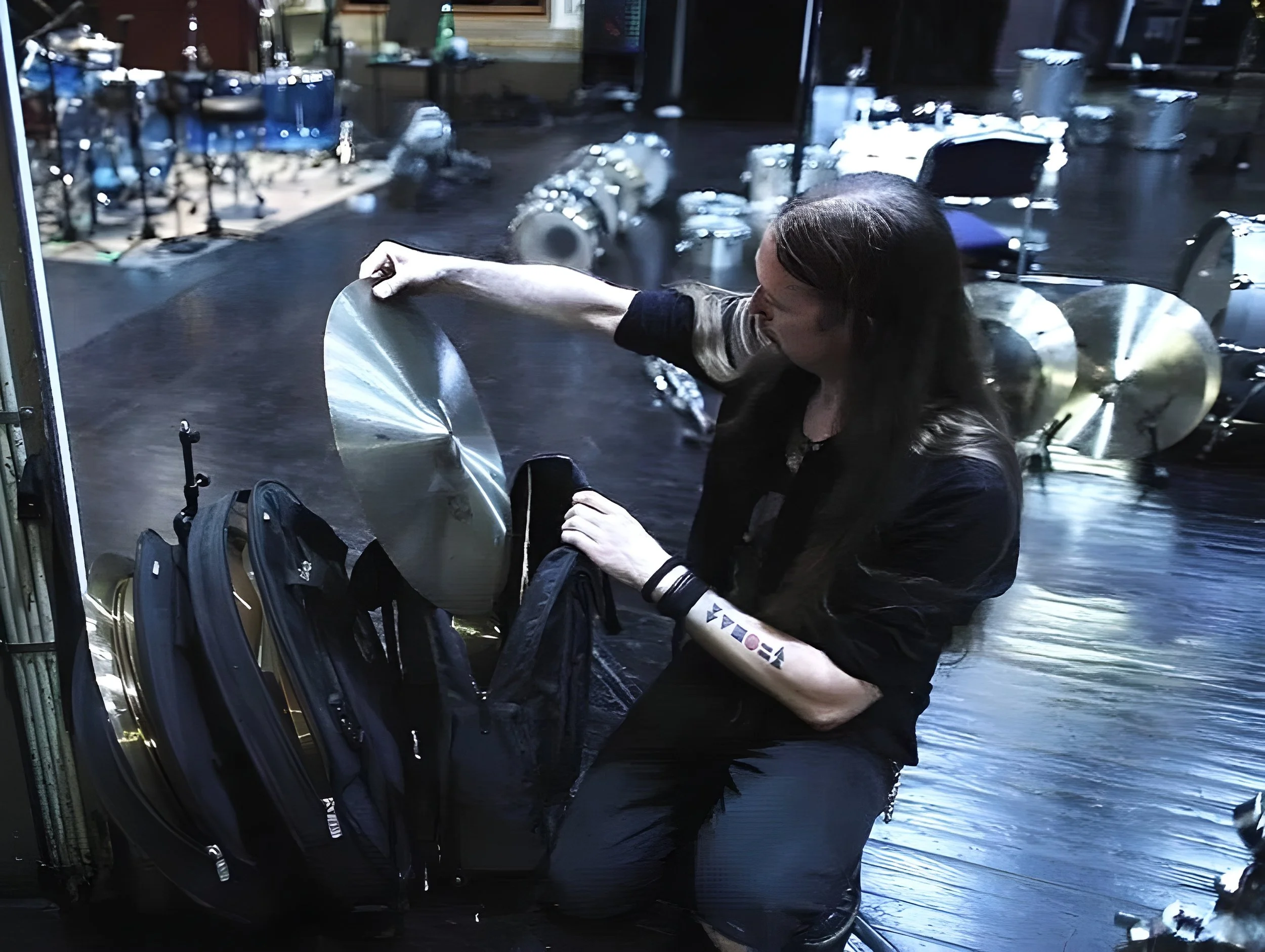 Our custom made Pearl Masterworks in birch, maple and carbon fibre, along with Sabian cymbals. This kit features big sizes and thin drumheads, and have an old-school sound full of overtones that sounds amazing in the room mics.